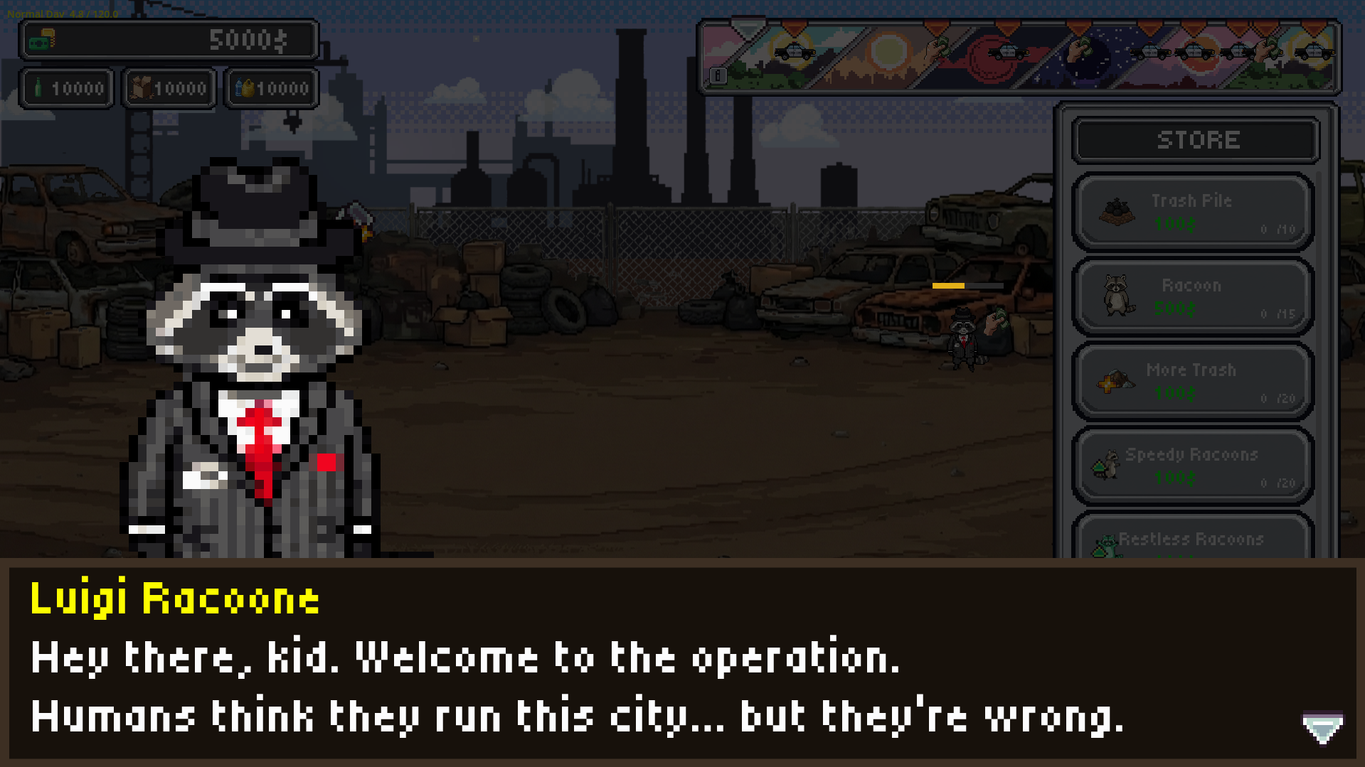 RACCOONATION is a game where a secret society of raccoons builds a junk-powered machine to transform all humans into raccoons.
